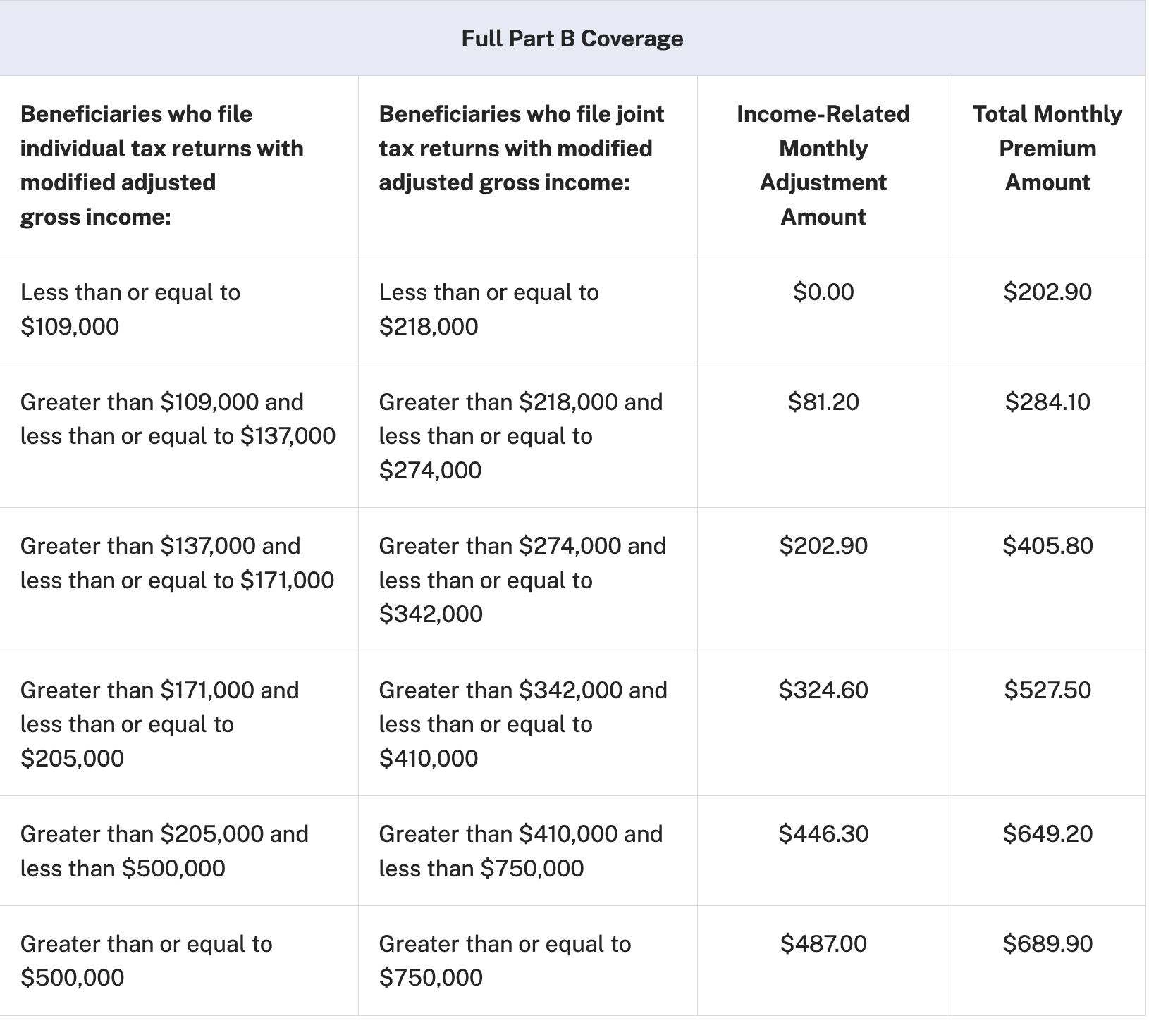 Medicare premiums are based on your modified adjusted gross income (MAGI). The standard Part B premium in 2026 is $202.9/month per individual, which is an increase of ~10% from the previous year of $185/month. As an FYI, Medicare uses the MAGI reported on your tax return from two years prior in determining your Part B premium.